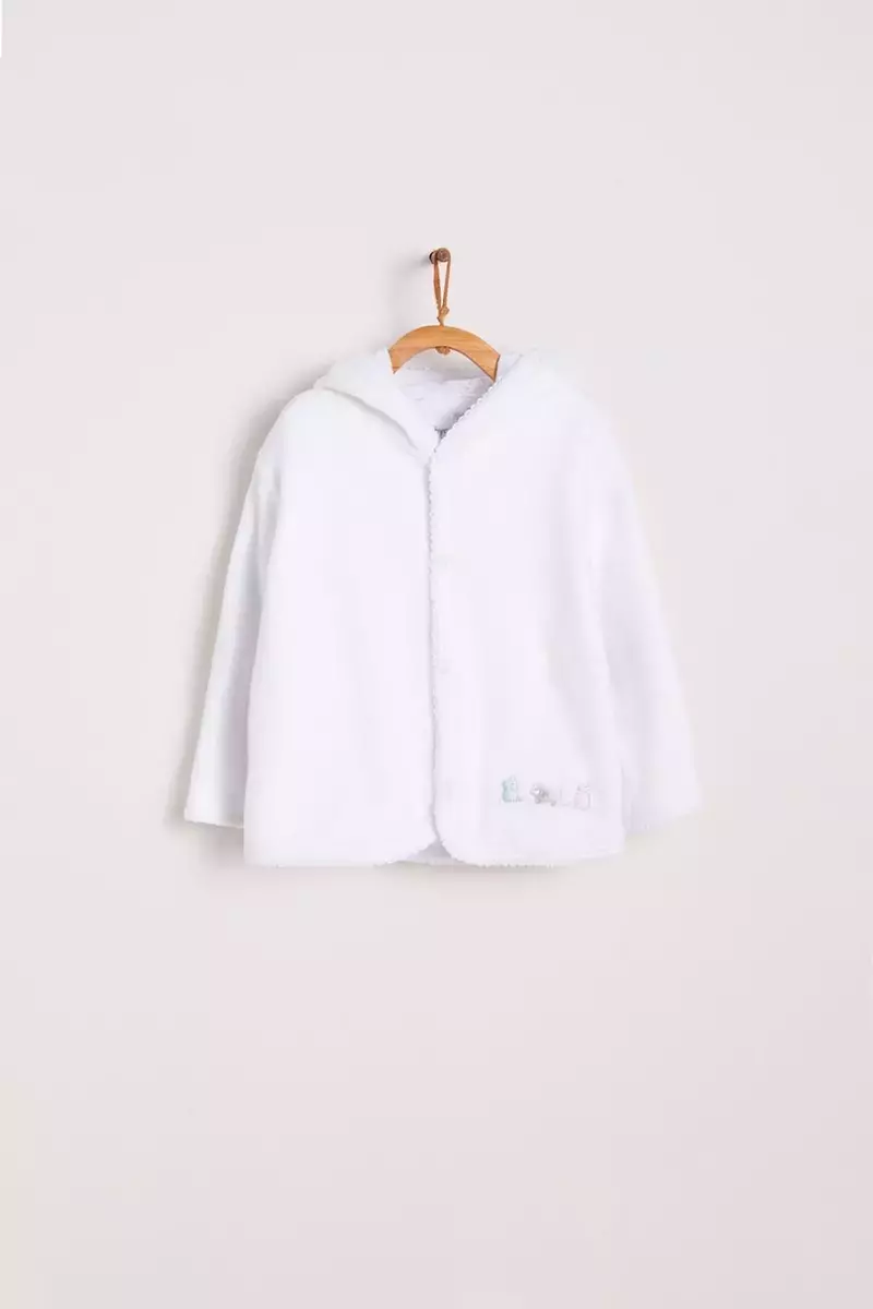 Cardigan de plush con interior de algodón pima, blanco con detalles bordados. Babycottons.